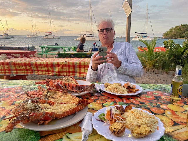 And to top it off, Greg treats us to grilled lobster at the beach BBQ shack just a stone’s throw away. What a way to start this cruise.