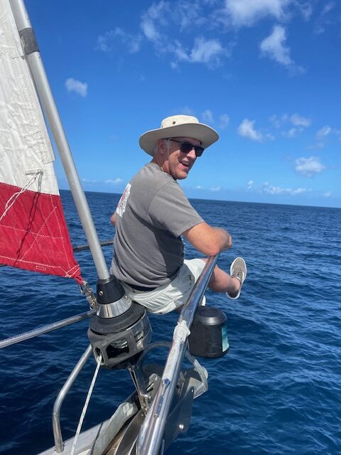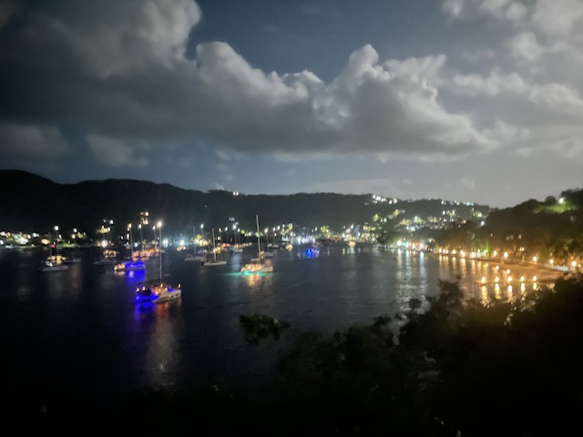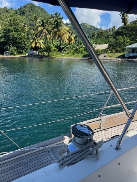 Today, Friday, the sun is finally back. The wind is stronger still, 25–30 knots, and due east. We set sail early and point the bow toward St. Vincent. The eight-mile channel funnels wind and swell; soon we’re heeled over on a beam reach, flying at eight and nine knots, even touching ten. A thrilling ride. We hit a few breaking swells that send green water over the cockpit and drench us both — but it’s warm and glorious and we love it. Too soon, the ride ends; in the lee of St. Vincent the wind dies and we motor the rest of the way.