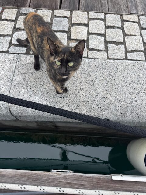 That night the weather remains unsettled, and the wind pipes up again. The anchorage is tight, boats all around, and we swing back and forth all night. I’m grateful for the anchor-alarm app on my phone that tracks our exact position and promises to wake me if we drag. I actually sleep; no alarm ever comes. Poor Greg, though — the motion, the unfamiliar noises, and the looming catamaran two lengths behind us keep him wide awake.